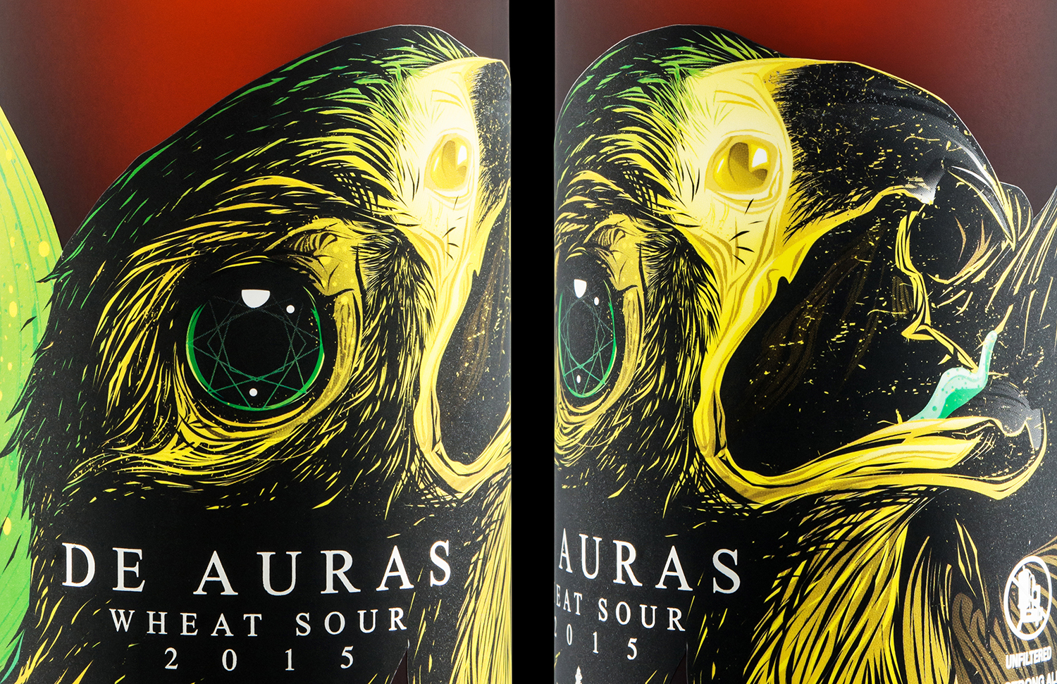 We created the name De Auras, resonating with the Bird of Prey names, and whose elevated nature causes narrative tension when set against the violent imagery. To contrast with the balanced, iconic stare of Obscuritas Dark Sour, we decided to illustrate the peregrine falcon’s unnerving sideways leer. The extreme close-up of the one eye adds a sense of dynamics and speed by contrasting with the violent silhouettes viewed from afar, their background echoing the eye.