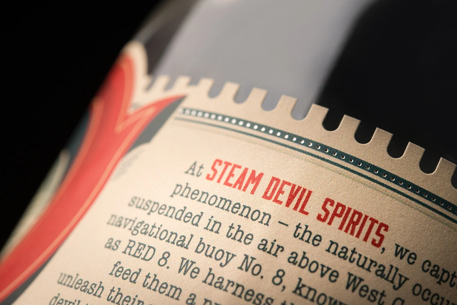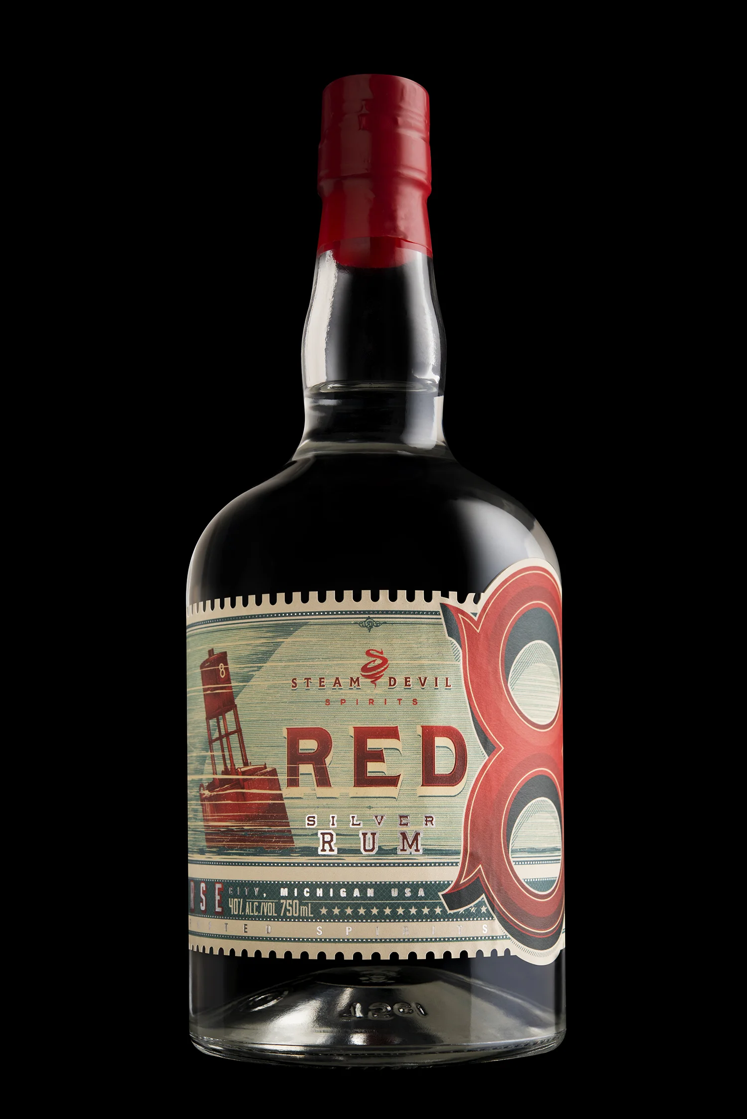 Steam Devil Spirits was a short-lived distillery on the shores of Lake Michigan in Traverse City, we designed a label that showcases the local landmark “Red 8” buoy – not just the namesake of this silver rum, but the location around which wild yeast was collected from the air and used in the rum’s fermentation process.