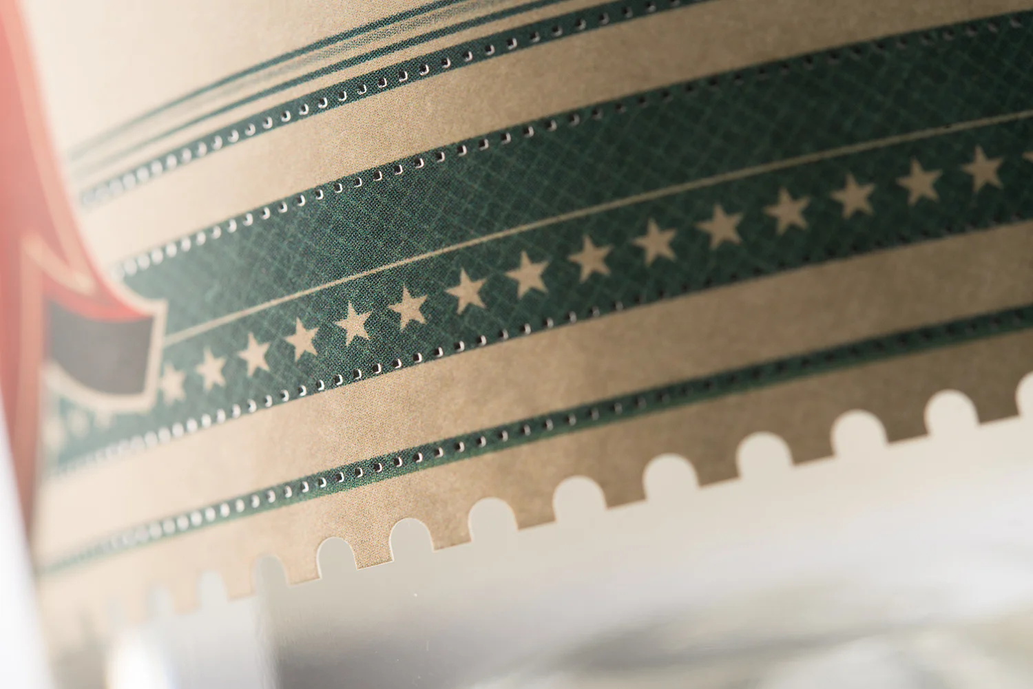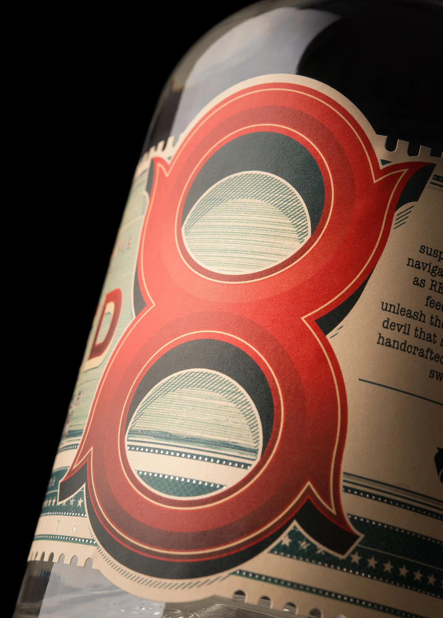 From a distance, the number ‘8’ jumps off the label with its bold graphic treatment, vibrant red-on-blue palette, and a scalloped dieline whose top and bottom edges are broken by the oversized figure. Coming in closer, our attention is drawn to another red echo: the buoy afloat on the vast blue lake, its meticulously rendered linework contrasting with the sleek number ‘8’.